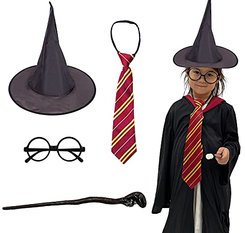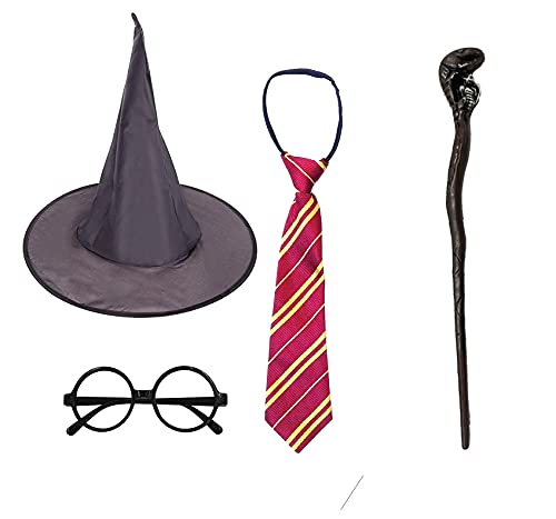 Costume Harry Potter Halloween, occhiali da mago in plastica, bacchetta, cravatta e cappello nero da strega per decorazione Halloween, 4 pezzi (modello B)