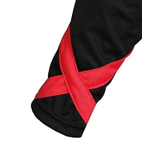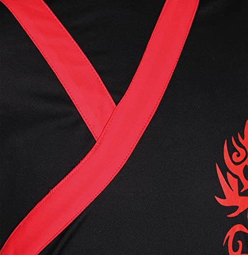 Include: un top nero a maniche lunghe con motivo drago rosso e cravatte rosse attaccate in vita, pantaloni neri con lacci a gamba rossa e cappuccio nero mascherato