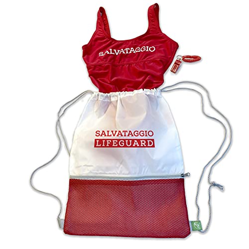 Costume Rosso Salvataggio Lifeguard Donna + Zainetto a Sacca con Tasca Esterna + Fischietto (Rosso XS)