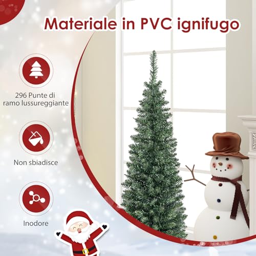 COSTWAY Albero di Natale Slim da 150/180 CM, Albero di Natale Artificiale con 296/390 Punte di Ramo, 150/180 Luci LED Bianche Calde, Supporto Pieghevole in Metallo (150 cm)