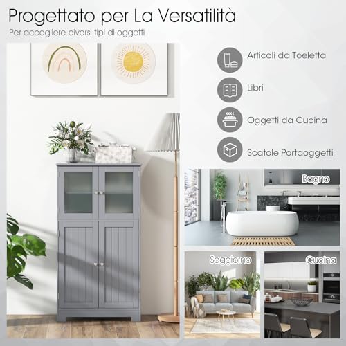 COSTWAY Armadietto del Bagno con 4 Ante, Armadietto con Ante di Vetro, Credenza di Legno con Mensole Regolabili, Organizer Multiuso per Casa Corridoio Salone Ufficio (Grigio)