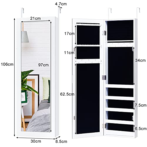 COSTWAY Armadio per Gioielli, Armadio Portagioielli Montato al Muro o Appeso alla Porta, Organizer Trucchi e Gioielli Salva Spazio, con Specchio a Figura Intera, Bianco