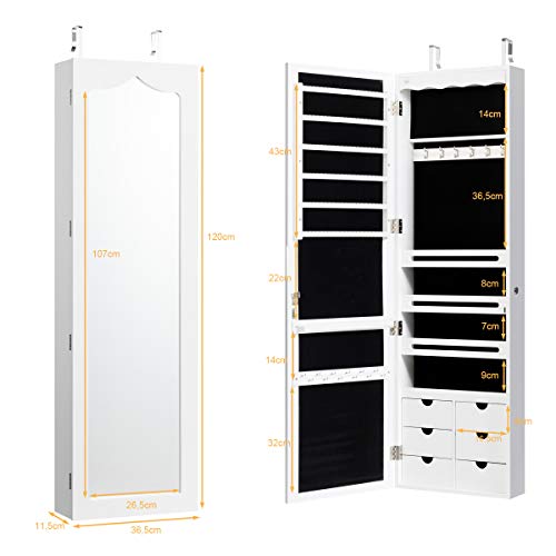 COSTWAY Armadio portagioielli con 5 Luci LED, Porta che Si Chiude, Armadio Portagioielli Montato a Muro con Specchio e 6 Cassetti, Organizer Gioielli con Tanto Spazio per Ragazze (Bianco)