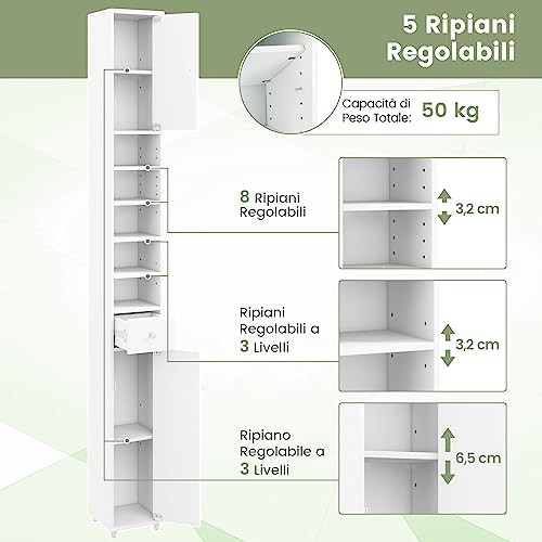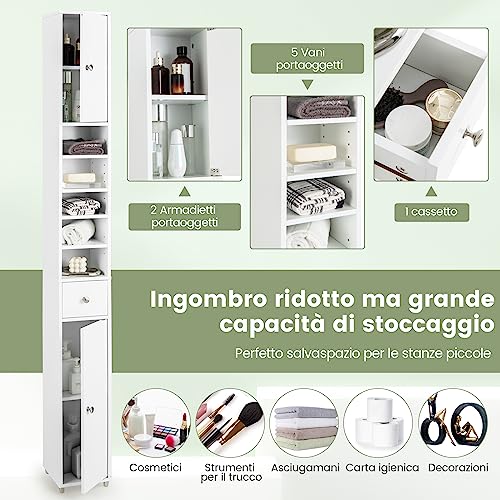 COSTWAY Armadio da Terra Alto, Mobile Colonna Bagno con 2 Ante 1 Cassetto e 5 Ripiani Regolabili, Mobile Bagno Salvaspazio per Bagno Soggiorno Camera da Letto, 20x20x180 cm