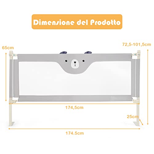 COSTWAY Barriera Letto per Bambini, Sponda di Sicurezza con Doppio Blocco di Sicurezza per Bambini, con Sollevamento Verticale, Lunghezza 145/174 cm, Grigio (174 cm, Stile 2)