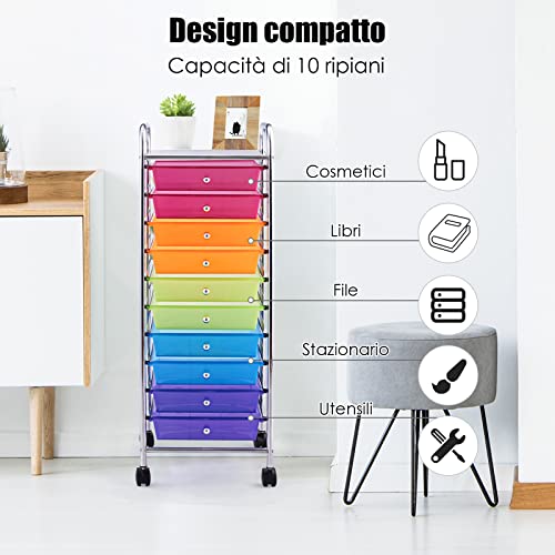 COSTWAY Carrello con 10 Cassetti da Stoccaggio, Cassettiera di Metallo e Plastica, Contenitore Multiuso con Ruote a Freno, per Casa e Ufficio (Multicolore)