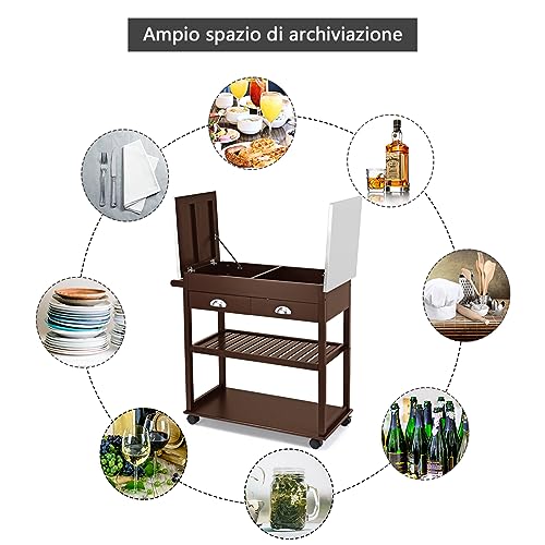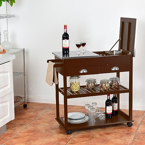 COSTWAY Carrello da Cucina con Ruote e Cassetti, con Superficie Apribile in Acciaio Inox e Maniglie, Carrellino Salvaspazio per Cucina Ristorante Bar, 87,5 x 40 x 82 cm (Marrone)