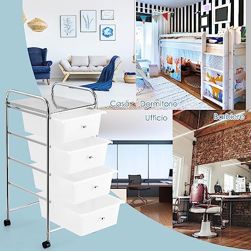 【Ampia Capacità di Stoccaggio】Dotato di 4 cassetti larghi e profondi, il nostro carrello di stoccaggio mobile è perfetto per conservare e ordinare vari oggetti. Inoltre, i cassetti sono rimovibili in modo da poterli facilmente staccare per pulirli o riorganizzare gli oggetti. Inoltre, l'ampio piano del nostro carrello di stoccaggio è ideale per esporre alcuni ornamenti.