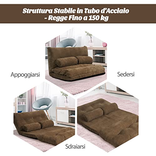 COSTWAY Divano da Terra, Divano Letto Multifunzionale Regolabile in 6 Posizioni con 2 Cuscini, con Fodera in Camoscio per Camera da Letto Salone Balcone (Caffè)