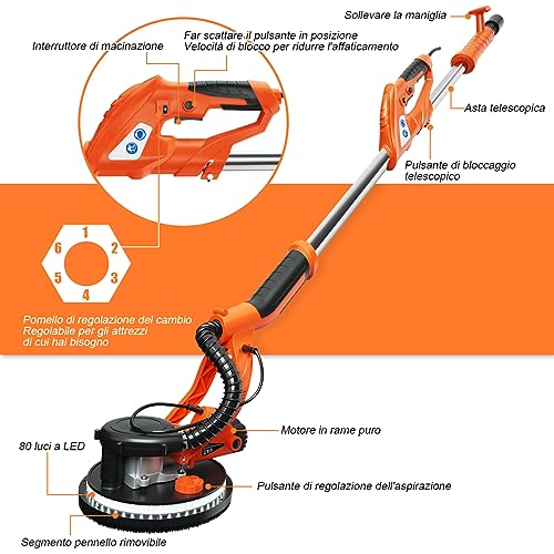 【Multiuso】Il motore di bronzo con 750 W è molto potente per carteggiare. Inoltre, la levigatrice corregge automaticamente le deviazioni orizzontali e carteggia ancora meglio. È la scelta perfetta per carteggiare i muri e il soffitto della casa.