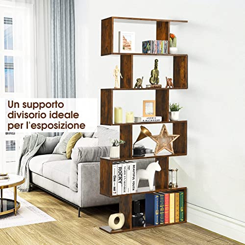 COSTWAY Libreria in Legno Scaffale Multifunzionale a 6 Ripiani per Piante e Libri per Ufficio Casa Ripiano a Forma di S, 80 x 23 x 192 cm (Caffè)