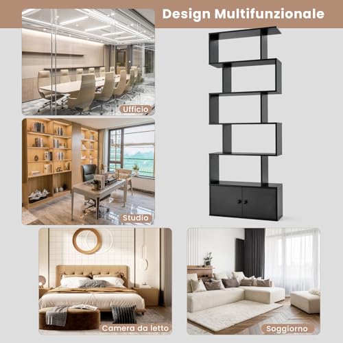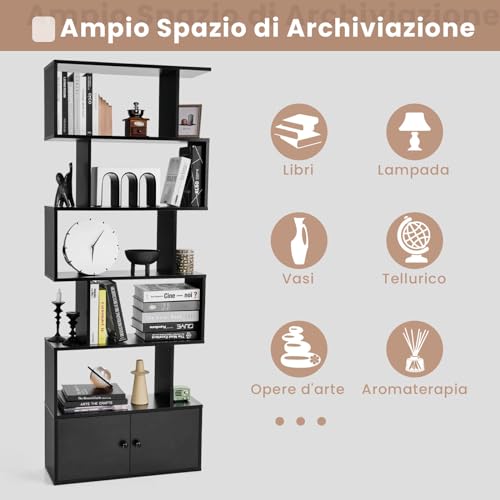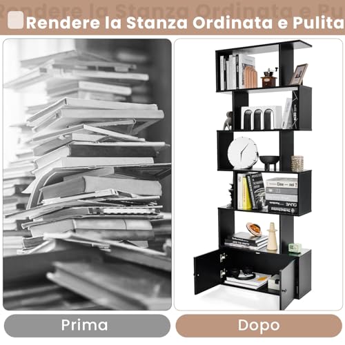 COSTWAY Libreria in Legno, Scaffale Multifunzionale con 5 Ripiani, per Ufficio,Casa, Ripiano a Forma di S, 70 x 23 x 183 cm (Nero)