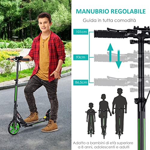 COSTWAY Monopattino Bambini e Adulti, Monopattino a Spinta Pieghevole e Regolabile in 3 Altezze, Monopattino Portatile con 2 Ruote, Cavalletto, Freno e Pedale Antiscivolo, Portata 100 kg (Verde)
