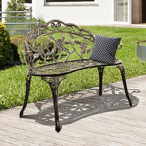 COSTWAY Panca da Esterno in Metallo, Panchina da Esterno con Schienale Decorativo, Braccioli Ergonomici, Panchina da Giardino, Balcone e Cortile, Portata 200 kg, 99 x 54 x 78,5 cm (Bronzo)