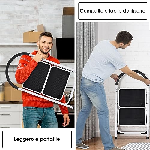 【Salvaspazio e facile da spostare】 Pieghevole e leggera, quando non in uso, la scala si ripiega, risparmiando spazio. E' facile da riporre e maneggiare.