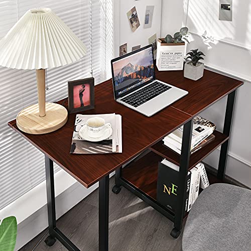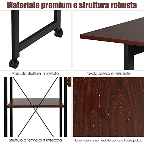 COSTWAY Scrivania Pieghevole per Computer, Scrivania Moderna con 2 Mensole, Postazione di Lavoro per PC con 6 Ruote, Scrivania Compatta Salva Spazio per Casa Ufficio, Marrone