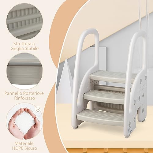 COSTWAY Sgabello a 3 Gradini per Bambini, Sgabello Scaletta per Bambini con Corrimani di Sicurezza e Gradini Antiscivolo, Capacità di Carico 75kg, per Cucina, Bagno, WC (Grigio)