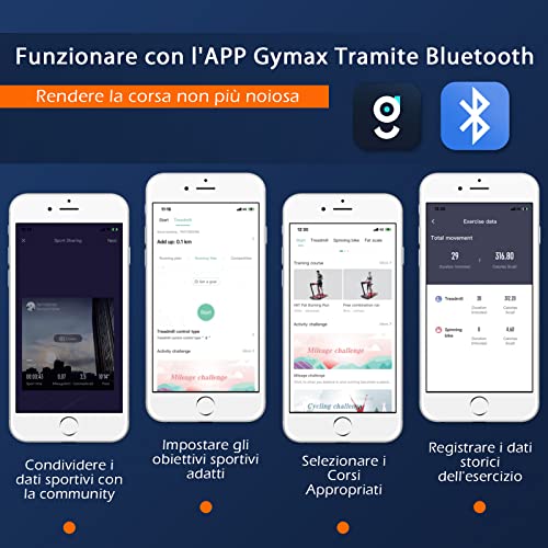 【Display LED e Controllo APP】Il display a LED mostra i dati dell'allenamento relativi a tempo, velocità, distanza e calorie per aiutarvi a conoscere la situazione sportiva attuale. È possibile controllare il display a LED tramite il telecomando. Collegato con l'APP via Bluetooth, è possibile registrare i dati dell'esercizio ed esplorare altre funzioni.
