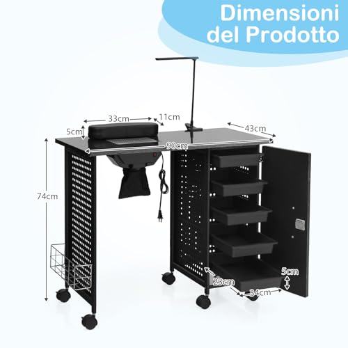 COSTWAY Tavolo per Manicure, Tavolo per Unghie per Salone con Ruote, Ventola Elettrica Incorporata, 5 Cassetti Rimovibili, per Casa e Salone