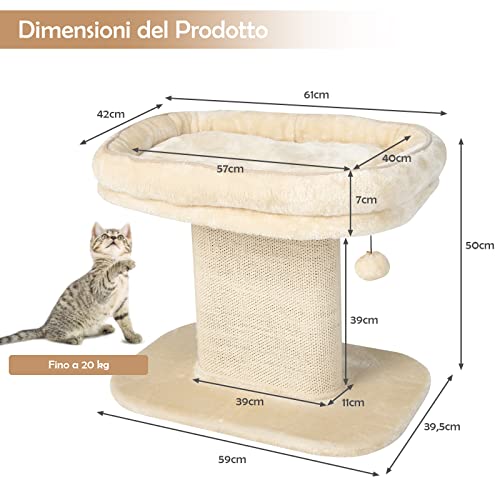 COSTWAY Tiragraffi per Gatti, Albero Tiragraffi Gatto con Grande Cuccia in Peluche e Tiragraffi in Sisal e Palla, Tiragraffi da Divano in Legno per Gatti Piccoli, Portata 20 kg (Beige)