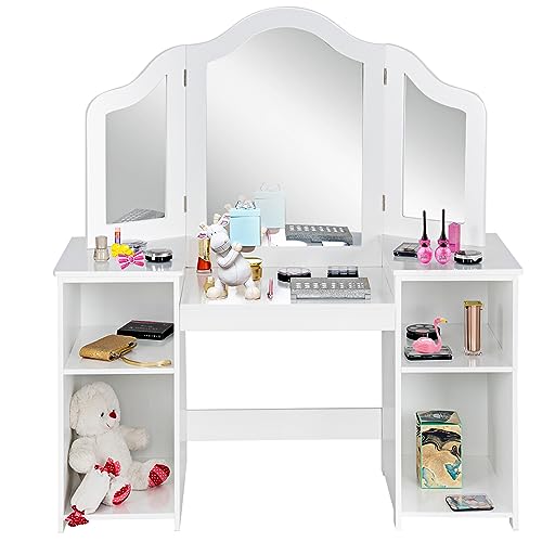 COSTWAY Toeletta per bambini in Legno, Design Smontabile 2 in 1, Mobile da Trucco Stile Principessa con 4 Mensole e Specchio, Mobile per Il Trucco per Bambini (Bianco)