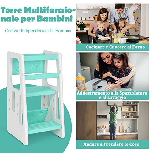 COSTWAY Torre di Apprendimento per Bambini con Barriera di Sicurezza, 3 Altezze Regolabili e Cuscinetti Antiscivolo, Ideale per Cucina, Bagno e Soggiorno, Carico Massimo 90 (Verde)