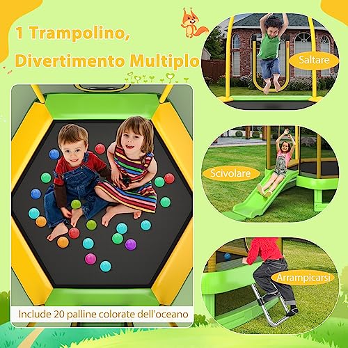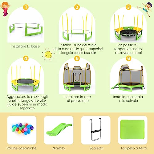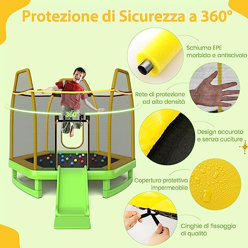 COSTWAY Trampolino Elastico per Bambini 223 cm, Tappeto Elastico per Bambini da Esterno ed Interno con Rete, Palline, Scivolo e Scaletta, Trampolino per Bambini 3+ Anni, Portata 270 kg