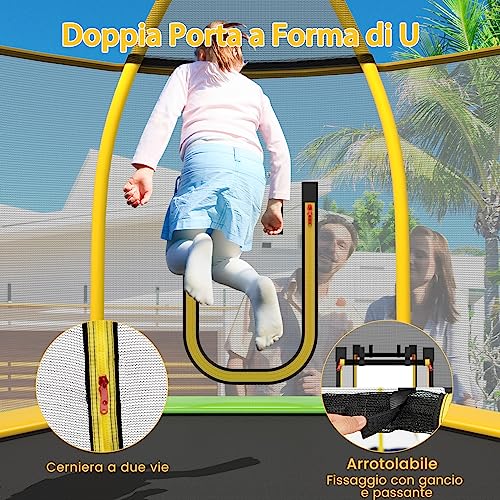 【Buona Sicurezza】La rete di protezione alta con porte a zip e i tubi imbottiti di schiuma offrono una protezione completa per i bambini in modo che possano saltare in tutta sicurezza. Inoltre, i bimbi possono entrare e uscire facilmente grazie alle 2 porte a forma di U. Il tappetino in dotazione svolge una funzione ammortizzante quando i bambini scivolano a terra.