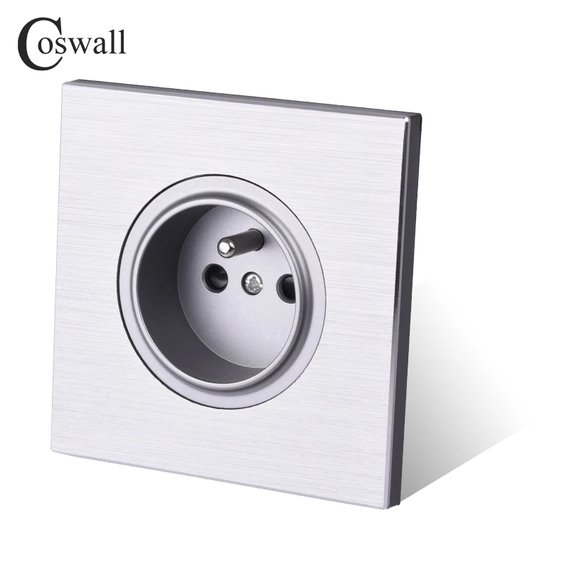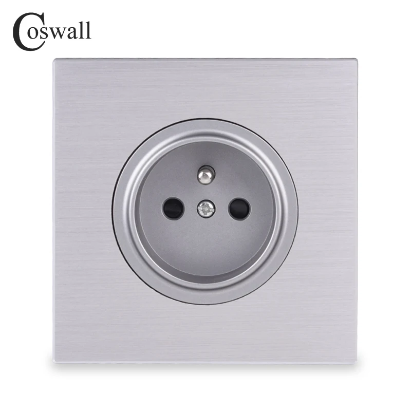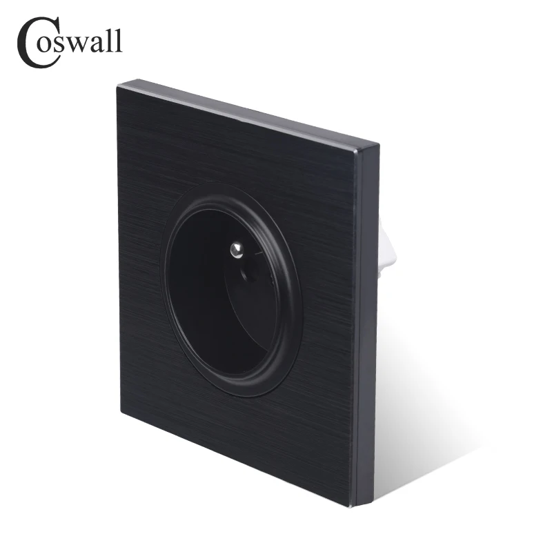 Coswall Black / Silver Grey Brushed Aluminum Panel French Standard Wall Power Socket Outlet Grounded With Child Protective Lock