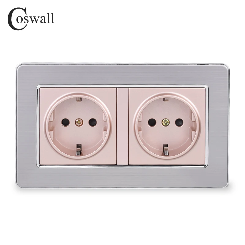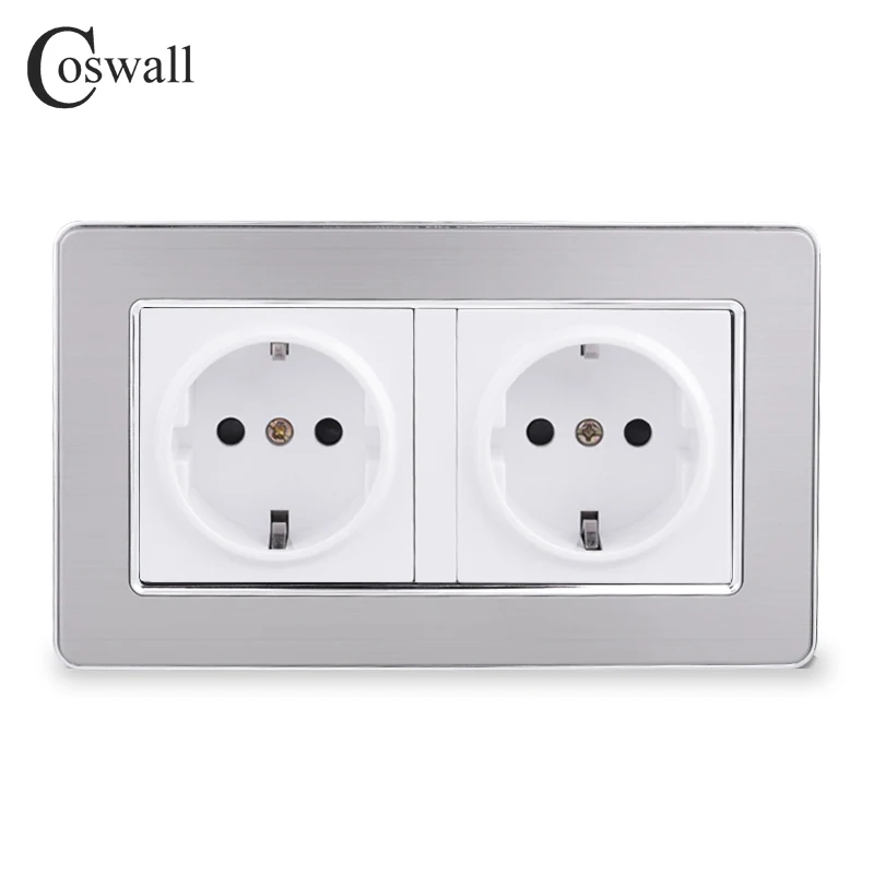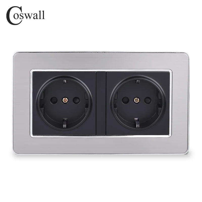 COSWALL 16A Double EU Standard Wall Socket Luxury Power Outlet Grounded Stainless Steel Panel With Children Protective Door