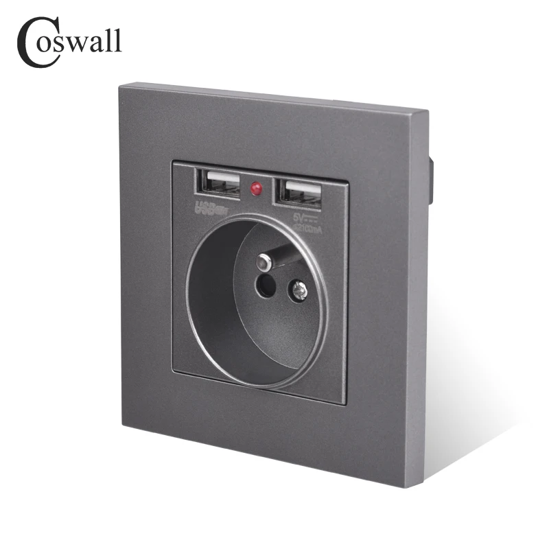 Coswall Dual USB Charging Port 5V 2.1A LED Indicator 16A Wall French Power Socket Outlet PC Panel Grey Black White Gold 4 Colors