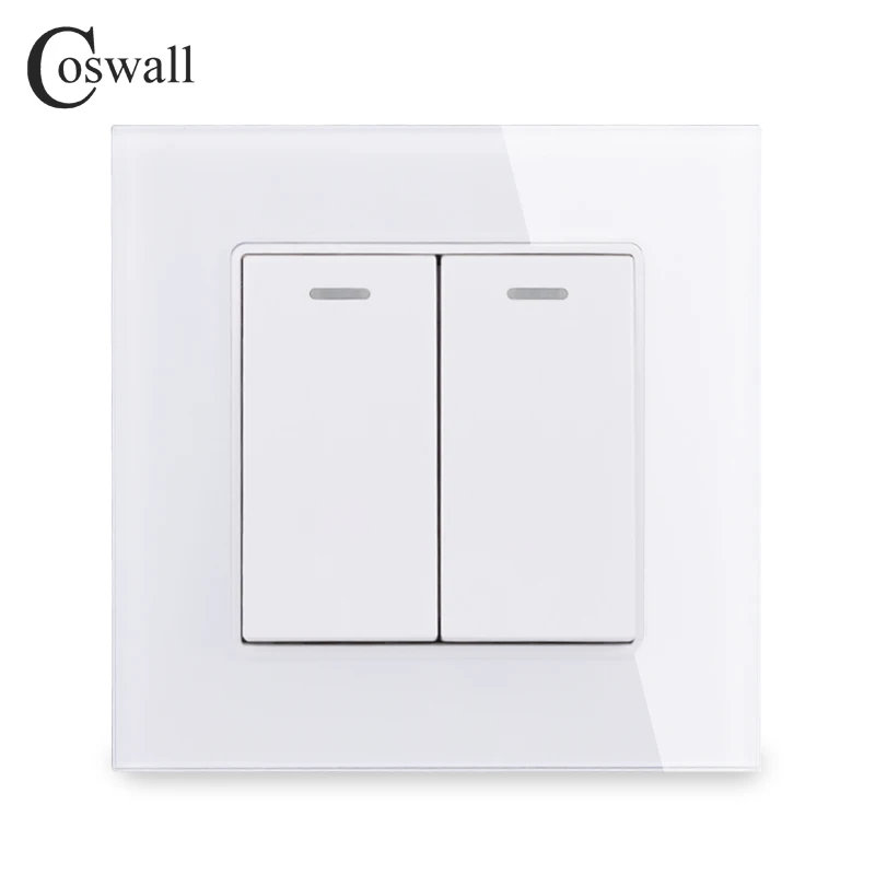 COSWALL 2 Gang 1 Way Crystal Tempered Glass Panel Light Switch On / Off Rocker Wall Switch Interruptor 16A Black White Grey Gold