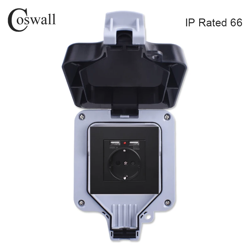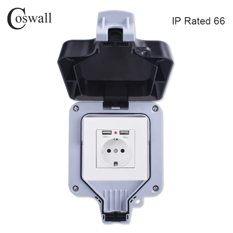 Coswall IP66 Weatherproof Waterproof Anti-UV Dust-proof Outdoor EU Standard Wall Socket With Dual USB Charging Surface Mounted