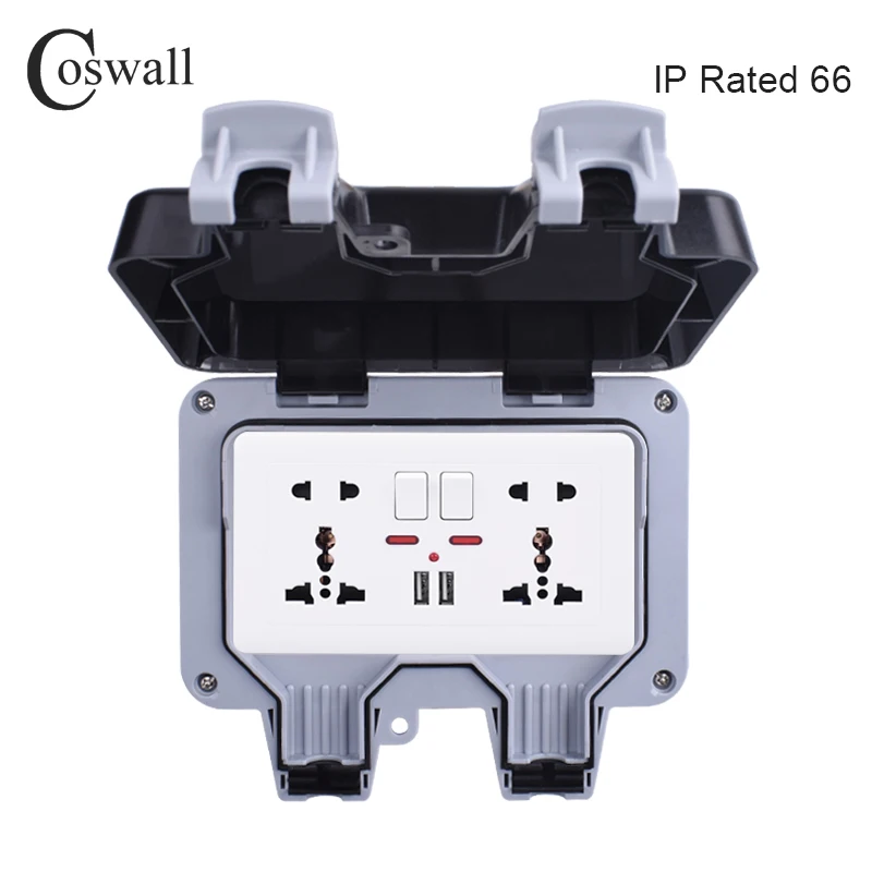 Coswall IP66 Weatherproof Waterproof Outdoor BOX Wall Socket 13A Double Universal / UK Switched Outlet With USB Charging Port