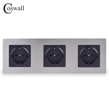 COSWALL Stainless Steel Panel Triple Wall Socket 16A EU Russia Spain Electrical Outlet Silver Black Color Child Protective Door