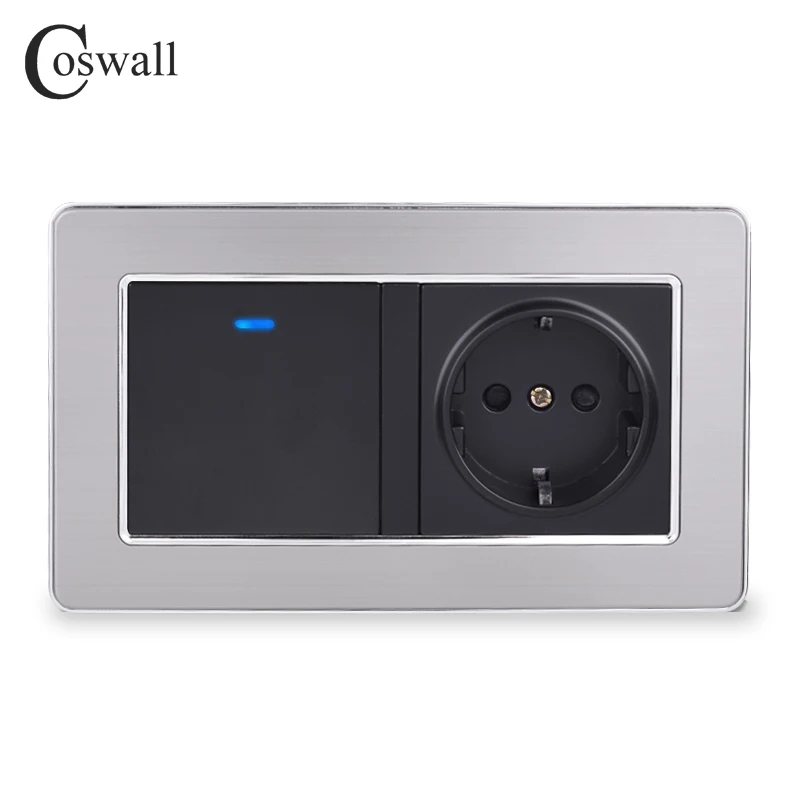Coswall EU Standard Wall Power Socket + 1 Gang 1 Way On / Off Light Switch With LED Indicator Stainless Steel Frame 146mm*86mm