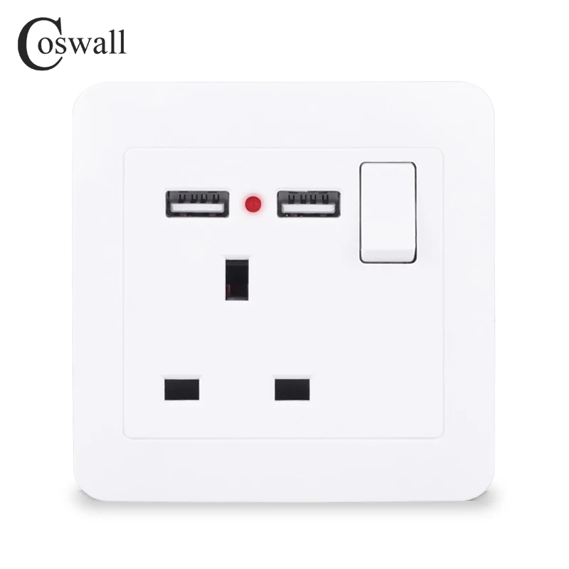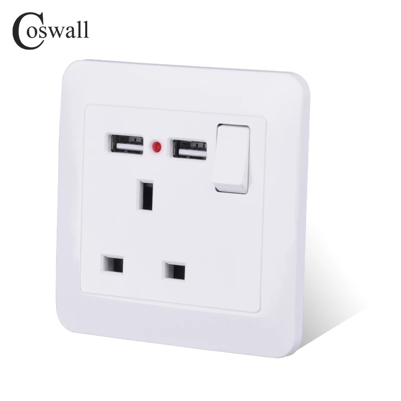 Coswall 13A Universal 3 Pin Wall Socket / British UK Standard Outlet Switched With 2.1A Dual USB Charging Port LED Indicator