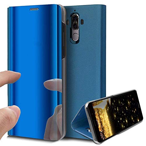 COTDINFOR Huawei Mate 20 Lite Custodia Placcatura Specchio Clear View Standing Cover Slim Mirror Flip Portafoglio Antiurto Case con Funzione Stand per Huawei Mate 20 Lite Mirror PU Blue MX.