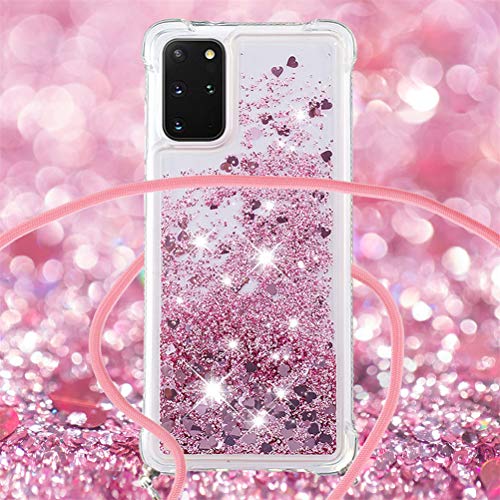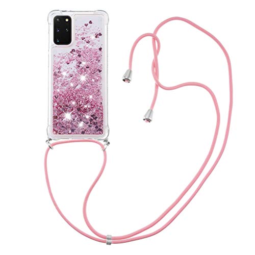 COTDINFORCA Compatible with Samsung Galaxy S20 Plus Custodia Bling Liquid Cases Glitter Sparkle Floating Silicone Shockproof Phone Cover per Galaxy S20 Plus Case Lanyard TPU Rose Love YB.