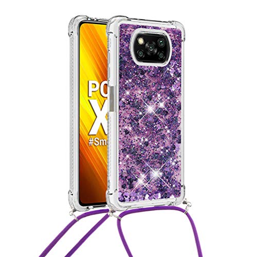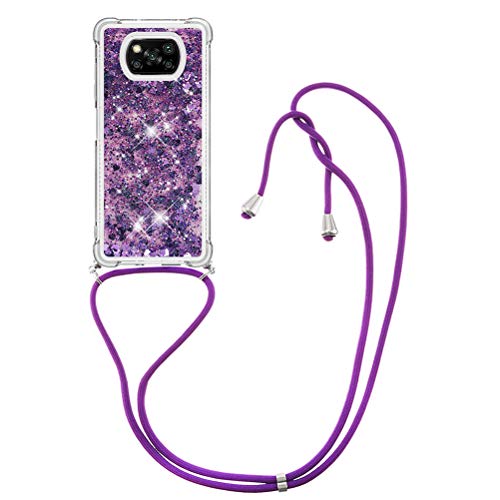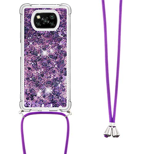 COTDINFORCA Compatible with Xiaomi Poco X3 NFC Custodia Bling Liquid Cases Glitter Sparkle Floating Silicone Shockproof Phone Cover per Poco X3 NFC Case Lanyard TPU Purple Love YB.