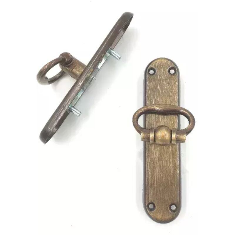 Cremonese per serramento esterno in ottone a pendente con movimento mp per aste interne. Dimensioni placca mm.160x37, impugnatura d.55 mm. Spessore d'ingombro totale mm.38 (placca compresa). Finitura ottone bronzato.