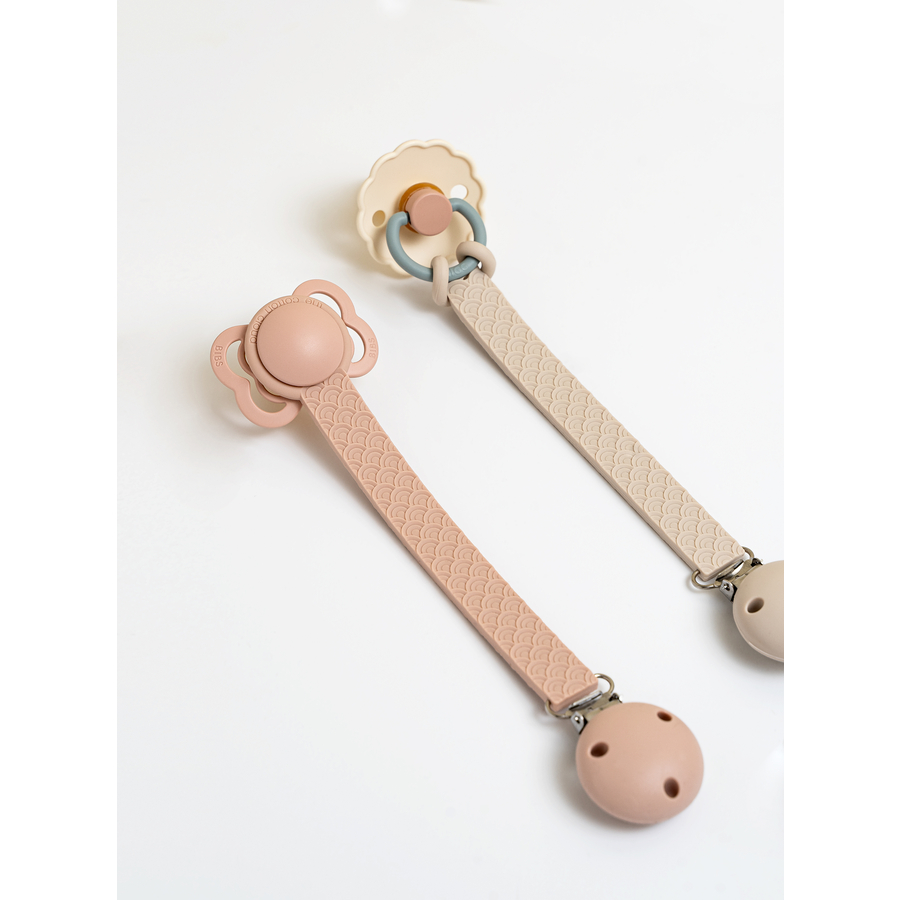 Dettagli del prodotto: Supporto per succhietto con occhiello universale per il fissaggio a tutti i succhietti La clip leggera mantiene il succhietto pulito e a portata di mano del bambino Fissaggio sicuro senza danneggiare gli indumenti Silicone alimentare Clip in metallo senza nichel e piombo Privo di BPA, PVC e ftalati Materiale e dimensioni: Realizzato in silicone alimentare, senza BPA Istruzioni per la conservazione e la cura: Lavare a mano, stendere in piano per asciugare. Tenere la clip lontano dall'acqua Avvertenze e istruzioni di sicurezza: Attenzione: per la sicurezza del bambino. Controllare il portaciuccio prima di ogni utilizzo. Gettatelo immediatamente al primo segno di danni o difetti! Non allungare mai il portaciuccio! Non agganciare mai il portaciuccio a corde, cinghie, laccetti o parti libere degli indumenti. Il bambino potrebbe strangolarsi. Fissare il portaciuccio solo agli indumenti del bambino. Non è consigliabile utilizzare il portaciuccio nel box, nel letto o nella culla. Sostituirlo immediatamente al primo segno di usura o di difetto. Non utilizzare senza sorveglianza Questo portaciuccio è conforme alla norma DIN EN 12586 (standard per i portaciucci). La fornitura comprende cotton Sand la catena portaciuccio in silicone cloud Scallop