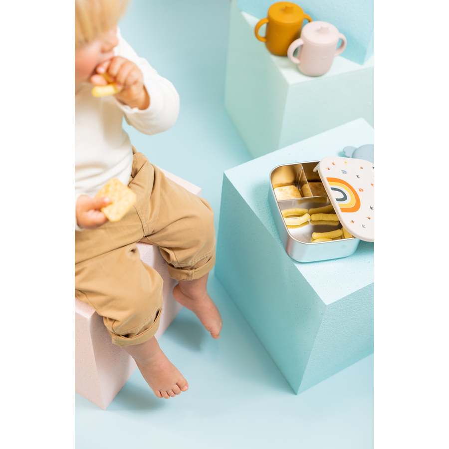 Dettagli del prodotto: Design: Arcobaleno Ideale per l'asilo, i pranzi scolastici, i picnic e anche per la conservazione degli alimenti Estremamente resistente e perfettamente portatile Acciaio inossidabile di alta qualità per uso alimentare, non arrugginisce Il coperchio in silicone non si deforma e non si rompe Tre scomparti per separare gli alimenti Leggero Sicuro per il frigorifero Sicuro per il congelatore Privo di BPA, PVC, piombo e ftalati Realizzato in acciaio inox 304 di alta qualità e silicone LFGB Non adatto al microonde Materiale e dimensioni: Materiale: acciaio inox 304, silicone alimentare. Realizzato in acciaio inossidabile 304 e silicone LFGB di alta qualità. Dimensioni (lunghezza x larghezza x altezza): 17 x 13 x 5,8 cm Volume: 1000ml