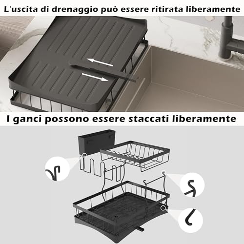 - Design rimovibile a 2 livelli: questo scolapiatti offre spazio sufficiente per piatti e posate. Inoltre, grazie al design rimovibile a due livelli, può essere riposto in modo salvaspazio.