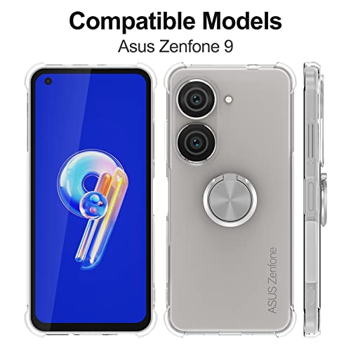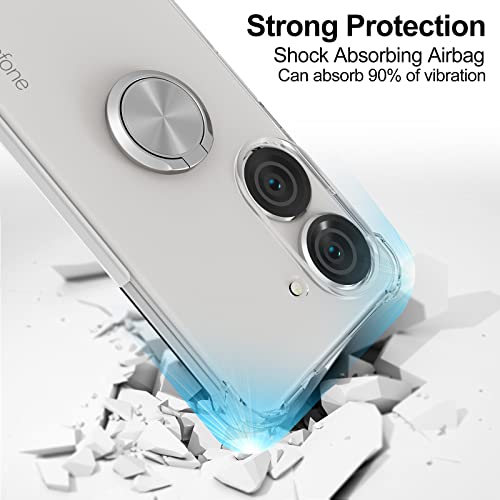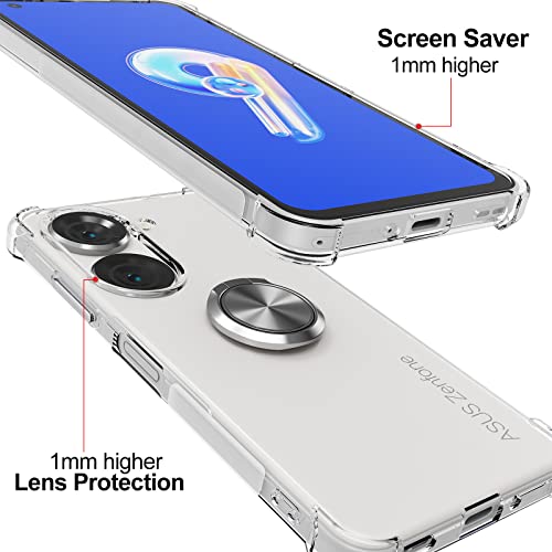 Cover Compatibile con Asus Zenfone 9, Custodia Trasparente Silicone con Anello Ruotabile Cavalletto, Quattro Angoli Anti-Caduta Crystal Clear Case - Anello Argento