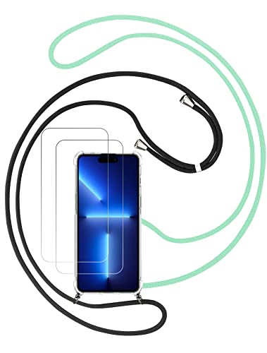 Cover con Cordino per iPhone 14 Pro (6,1"), 2 Pezzi di Vetro Temperato, Trasparente Custodia con Regolabile Collana Silicone Case TPU Bumper, Protezione Fotocamera, Nero+Verde