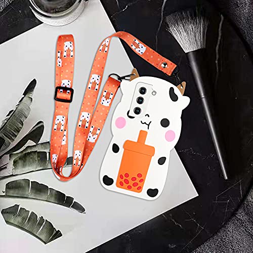 Cover del Fumetto per Samsung Galaxy S21 Plus 6,7", LCHDA Super Carino Progettazione di Cartoni Animati 3D Custodia Morbida in Silicone con Tracolla Copertura Protettiva Antiurto, Mucca da Latte