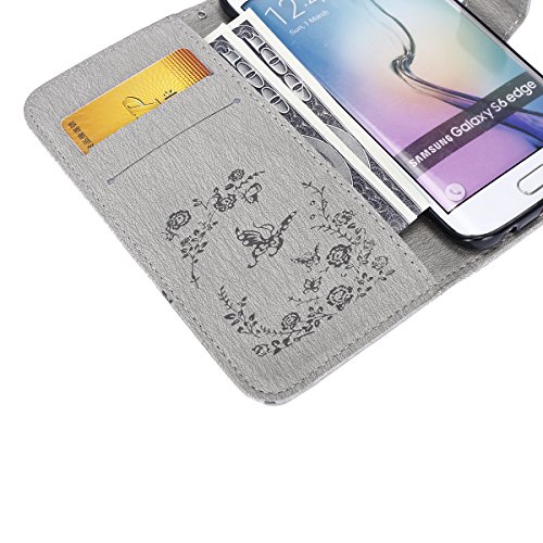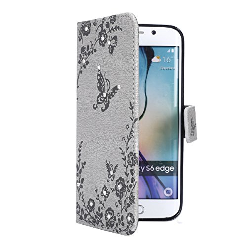 Cover Galaxy S6 Edge,Custodia Galaxy S6 Edge,Bling scintillio lucido Goffratura rilievo fiore farfalla Flip Cover Portafoglio PU Pelle Protective Wallet Stand Custodia Cover per Galaxy S6 Edge,Grau