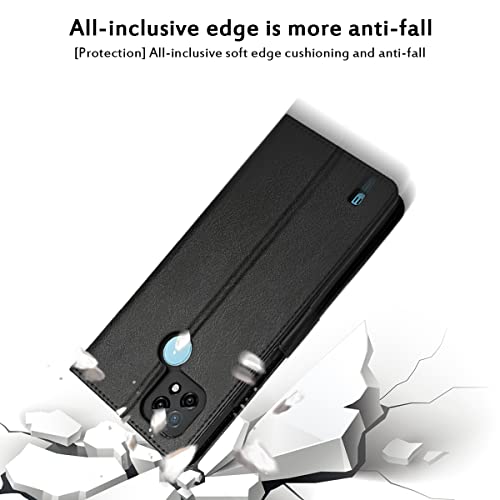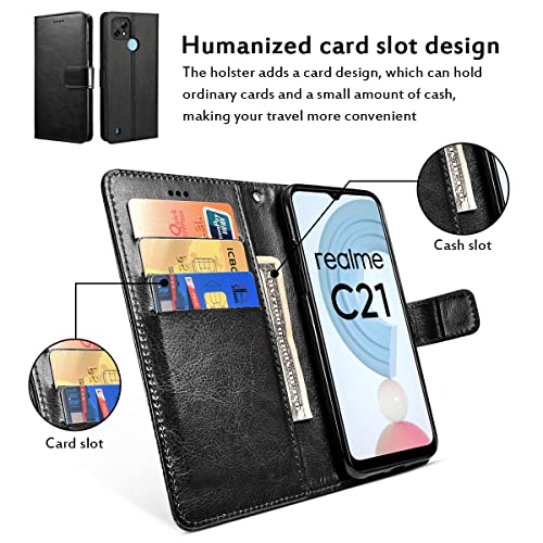 Cover per Realme C21, Nero PU Pelle Portafoglio Libretto Flip Protettiva Custodia con Uno Vetro Temperato Pellicola Protettiva per Realme C21 6.5"