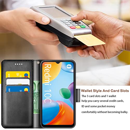 Cover per Xiaomi Redmi 10C / Poco C40, Nero PU Pelle Portafoglio Libretto Flip Protettiva Custodia con Uno Vetro Temperato Pellicola Protettiva per Xiaomi Redmi 10C (6,71 Pollice)
